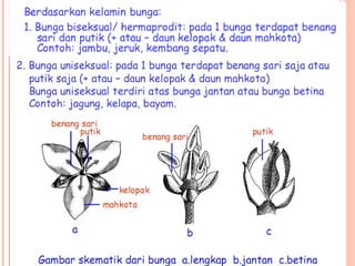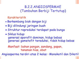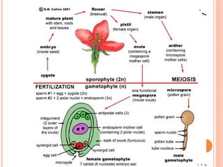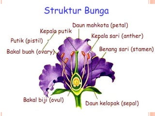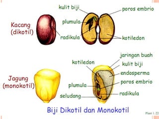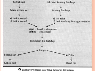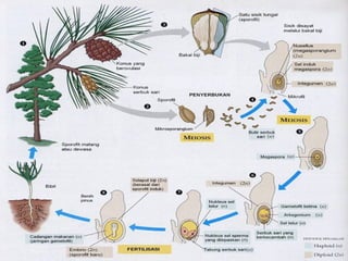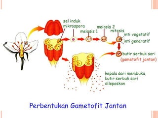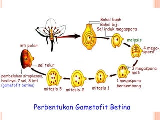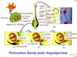 Dokumen tersebut membahas tentang proses pembuahan pada tumbuhan berbiji. Terdapat gambaran tentang struktur organ reproduksi tumbuhan gymnosperma dan angiosperma beserta proses pembuahan yang terjadi, yaitu pembuahan tunggal pada gymnosperma dan pembuahan ganda pada angiosperma.