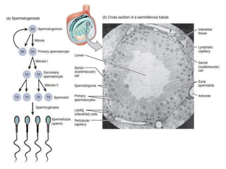Spermatogenesis is the process by which sperm cells develop from stem cells in the seminiferous tubules of the testes. It begins with the mitotic division of spermatogonial stem cells into primary spermatocytes, which then undergo meiosis to form haploid spermatids. The spermatids develop tails and mature into spermatozoa through spermiogenesis. Sertoli cells support this process by maintaining the environment, secreting substances, and protecting the developing cells. Spermatogenesis is regulated by hormones like testosterone and FSH and sensitive to fluctuations in temperature.