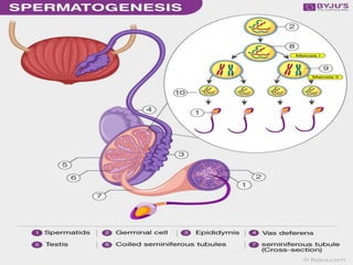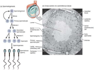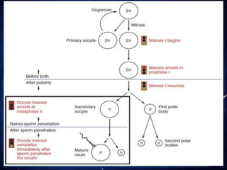 The document provides a detailed overview of oogenesis and spermatogenesis, the processes of gamete formation in females and males, respectively. Oogenesis begins in the fetal stage and involves several stages including pre-natal, antral, and pre-ovulatory phases, resulting in one functional ovum per cycle. In contrast, spermatogenesis is a continuous process that begins at puberty and produces millions of sperm daily, with distinct stages such as spermatocytogenesis, spermatidogenesis, and spermiogenesis.