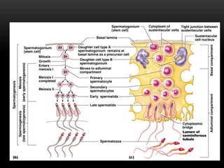 The process of spermatogenesis occurs in the seminiferous tubules of the testes and involves the formation and maturation of spermatozoa from spermatogonia. It begins at puberty and has five stages: 1) spermatogonial multiplication, 2) growth, 3) first meiotic division, 4) second meiotic division, and 5) spermiogenesis. During spermiogenesis, spermatids undergo morphological changes to become spermatozoa, including condensation of the nucleus and formation of the flagellum. Mature sperm are stored in the epididymis and acquire motility and the ability to fertilize an egg through maturation.