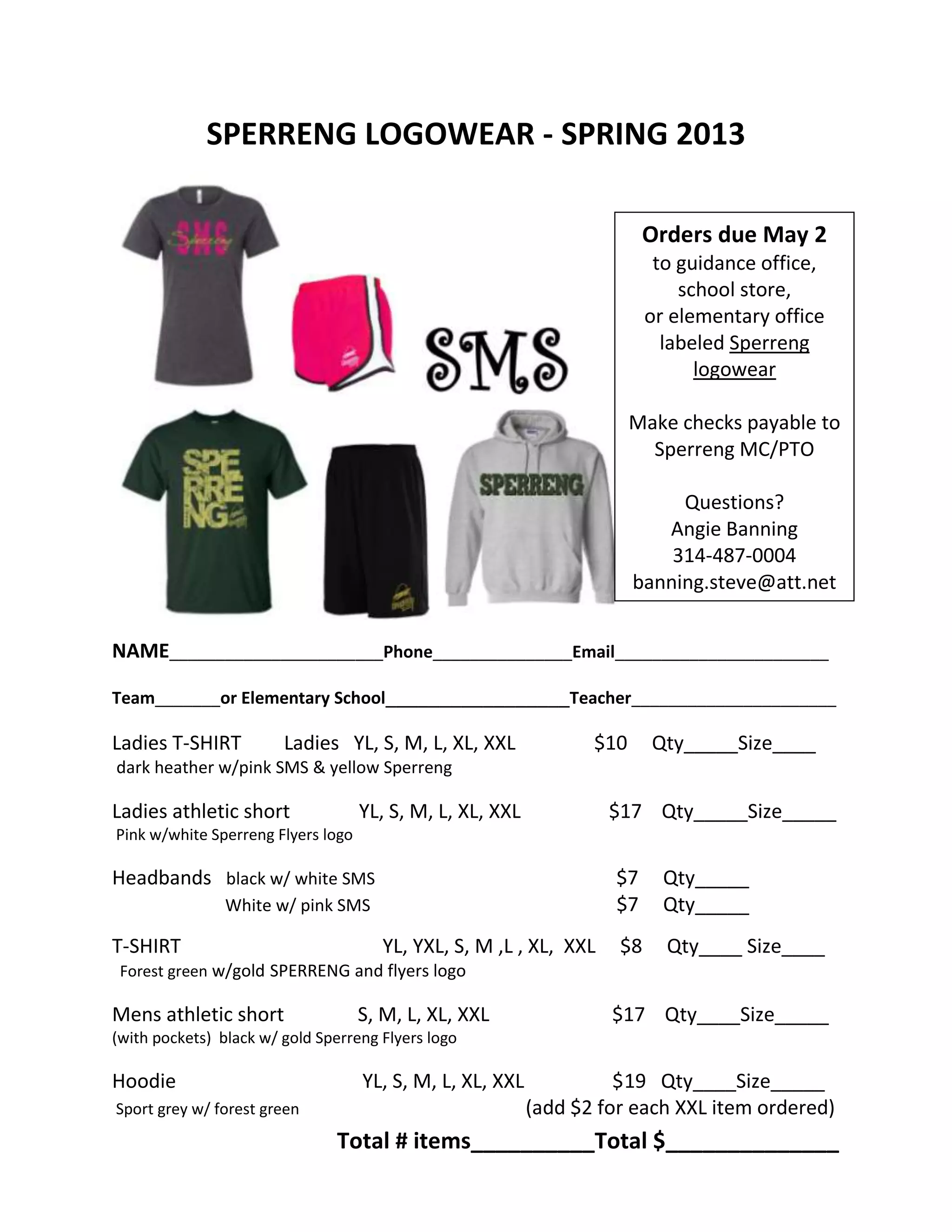 This document is an order form for Sperreng Middle School logo wear to be sold through May 2nd. It lists various items like t-shirts, shorts, headbands, and hoodies available for order along with sizing and pricing information. Orders and payment should be submitted to the guidance office, school store, or elementary office by the due date. Questions can be directed to Angie Banning.