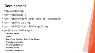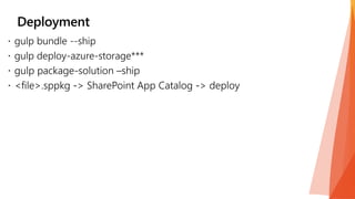 The document outlines a series of methods and configurations for interacting with SharePoint lists using SPHttpClient in a web part context. It includes functions for retrieving, creating, updating, and deleting list items, as well as guidance on using Office UI Fabric components and best practices for managing web part data and status. Additionally, it emphasizes the use of reusable components and required libraries such as SP PnP JS within the SharePoint framework.
