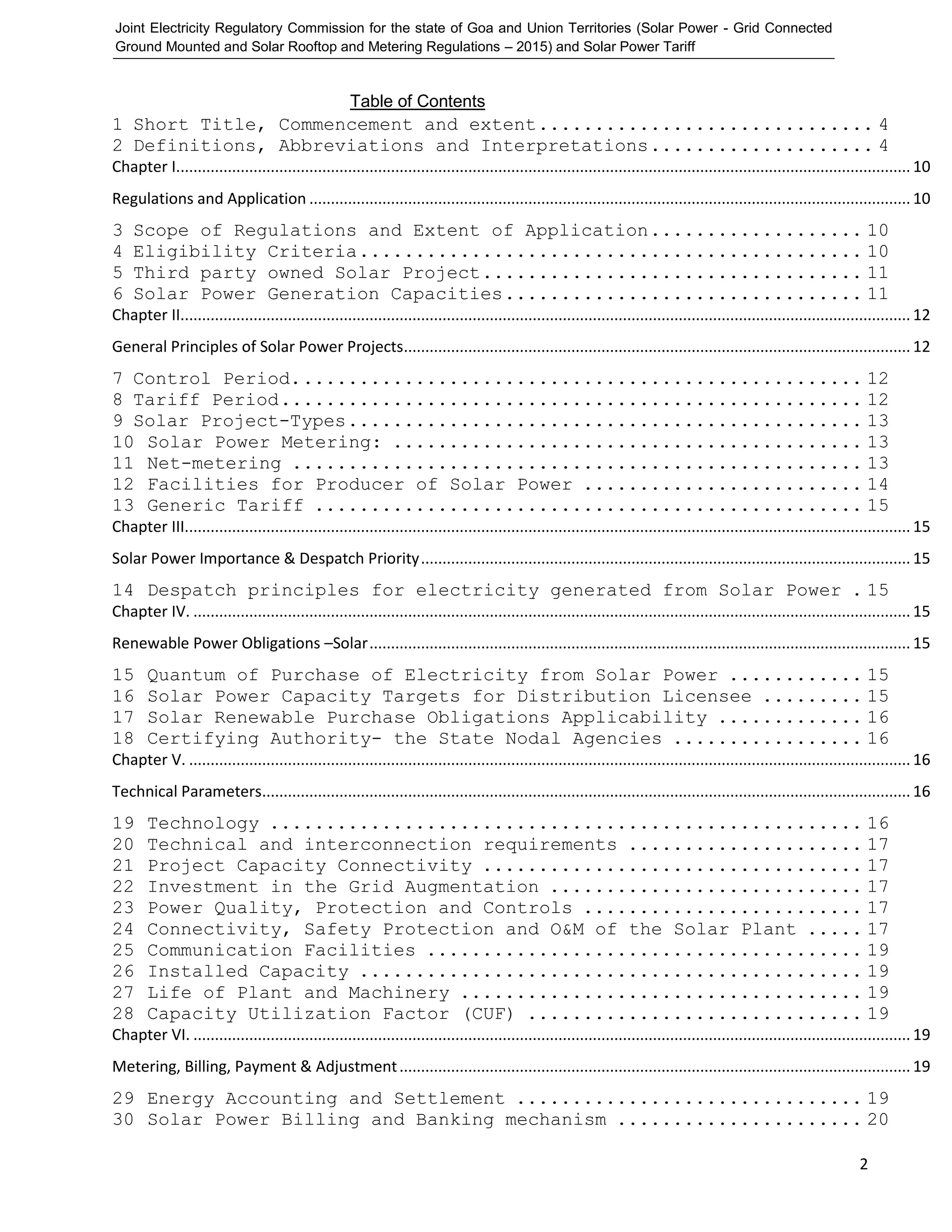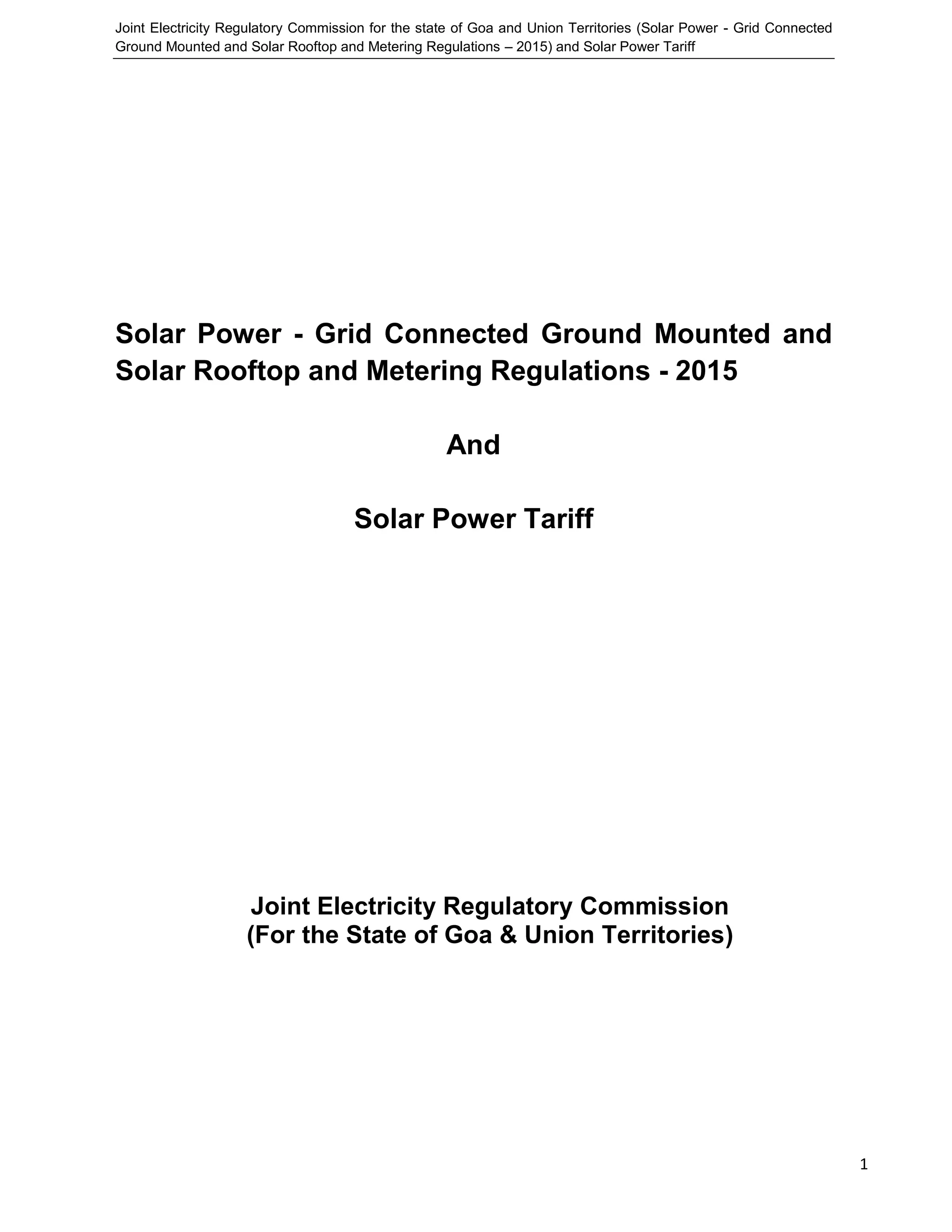 This document outlines regulations for grid-connected solar power projects in Goa and Union Territories. It defines key terms related to solar power projects and regulations. The regulations cover the scope, eligibility criteria, technical parameters, metering and billing, tariff structure, and other financial and administrative aspects of setting up and operating grid-connected solar power projects in the region. The overall aim is to promote the development of solar energy generation through these regulations.