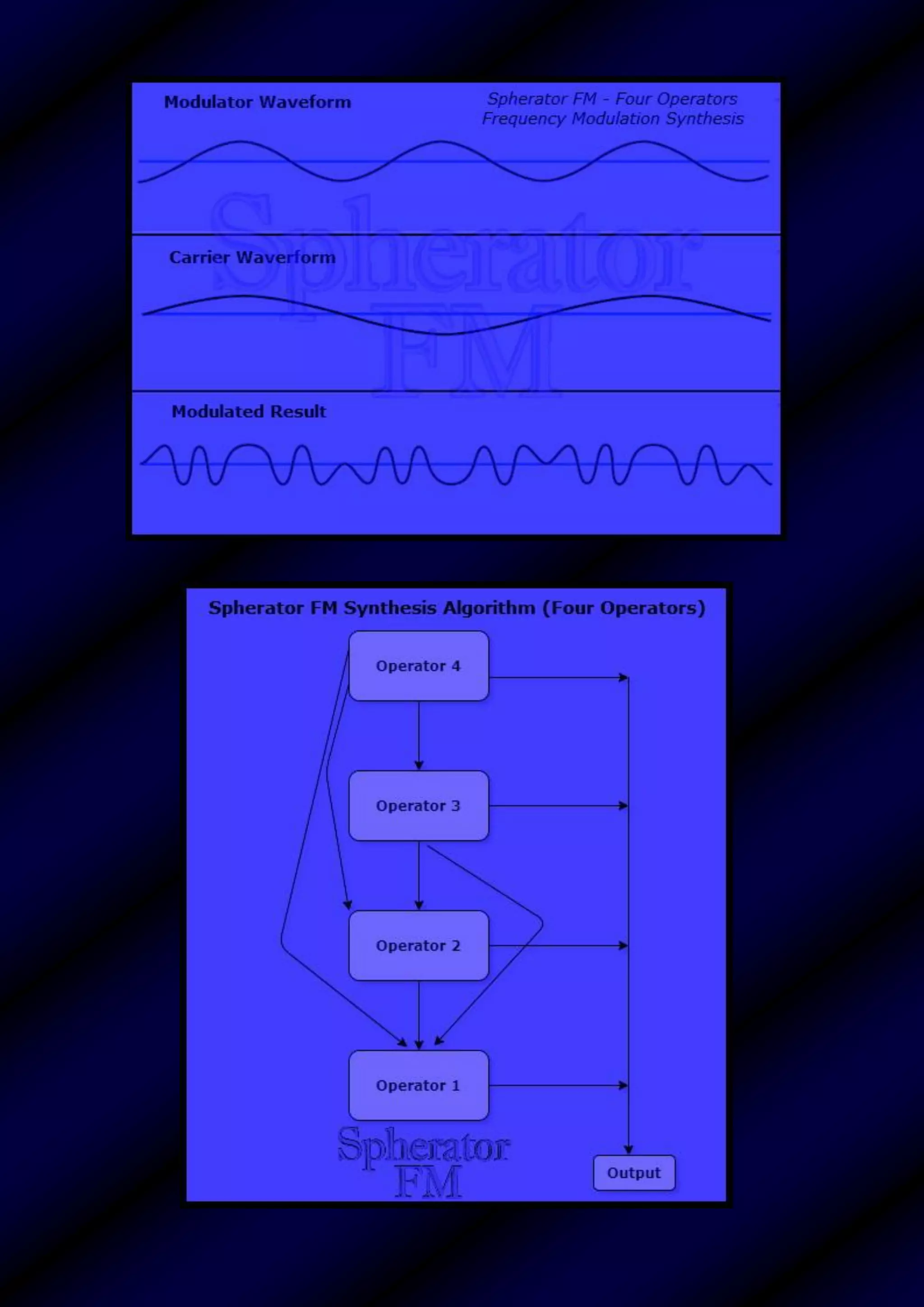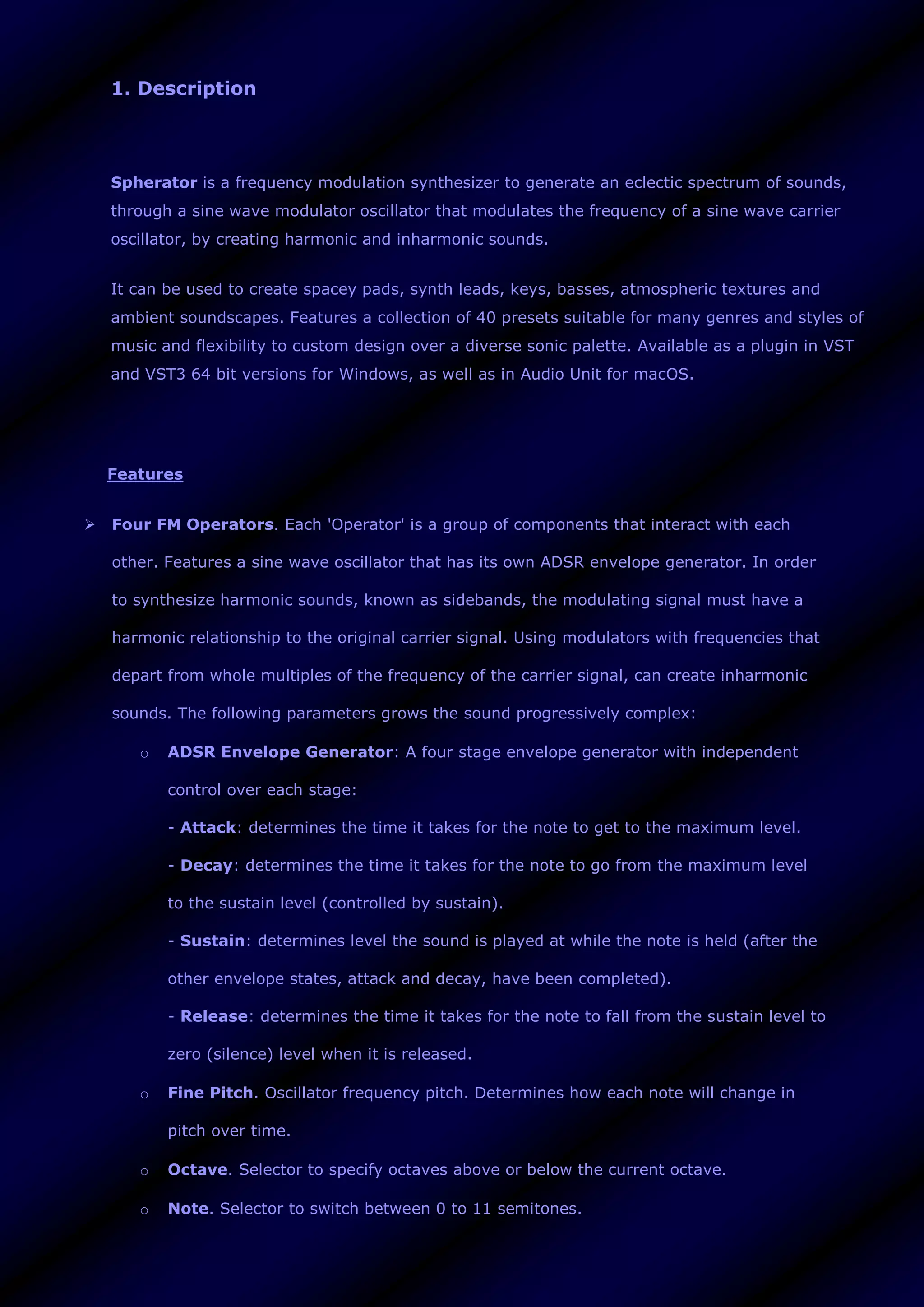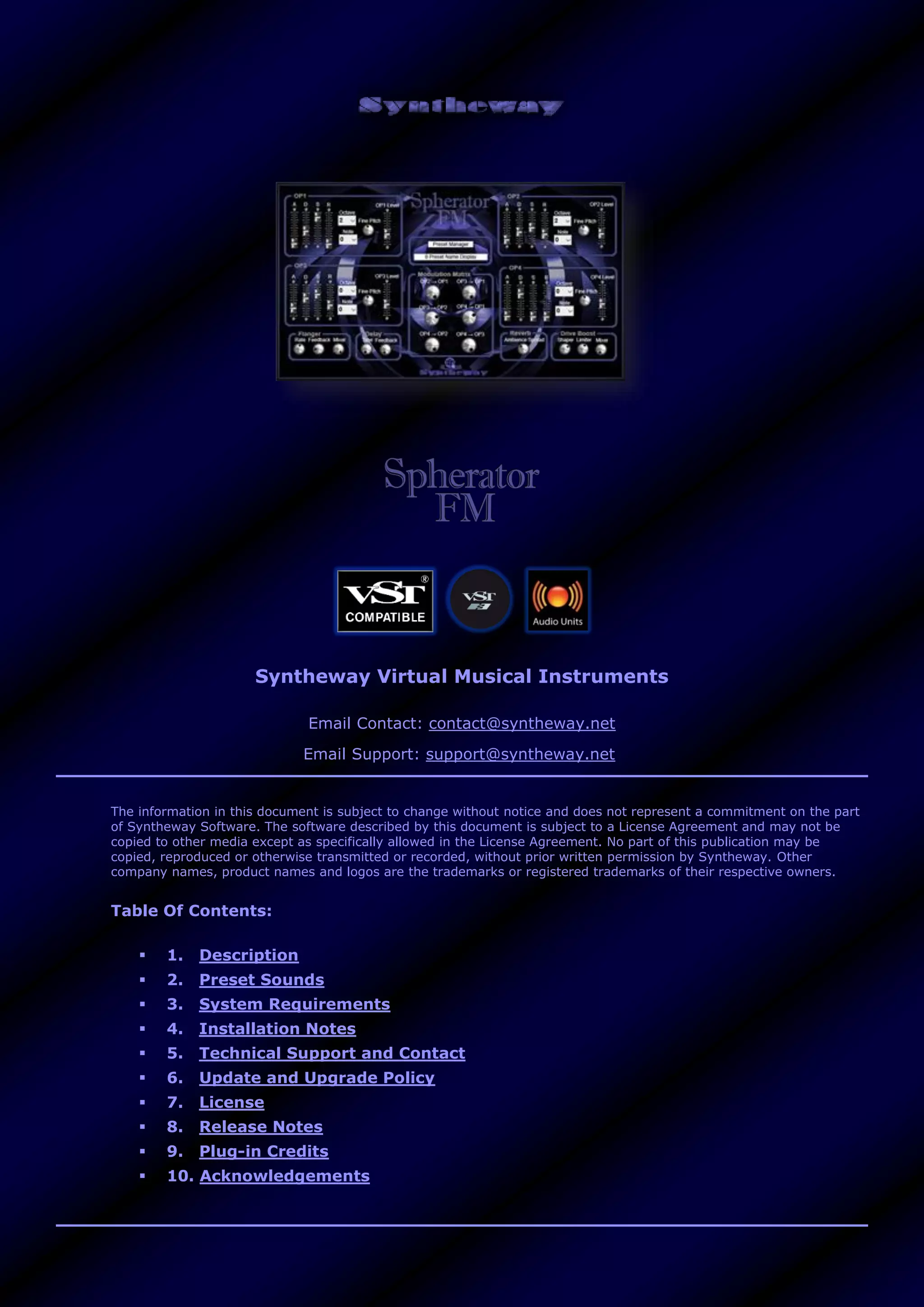 The document contains detailed information about 'Spherator,' a frequency modulation synthesizer offered by Syntheway, including its features, preset sounds, system requirements, and installation notes for both Windows and macOS. It outlines the software's capabilities for generating various sound types and managing presets, emphasizing the modulating features of its operators. Technical support and contact information for Syntheway is also provided, along with licensing and usage guidelines.