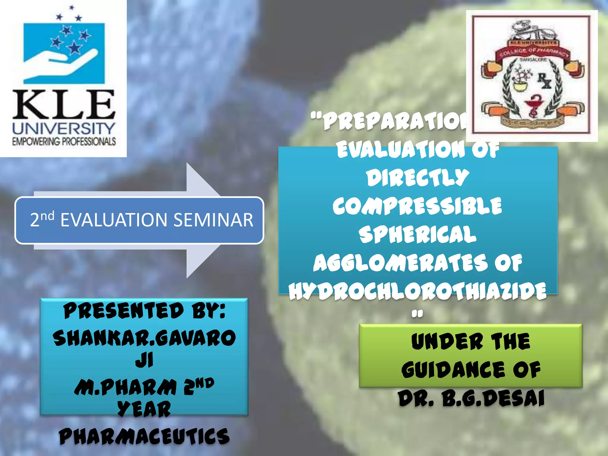 The document summarizes the preparation and evaluation of spherical agglomerates of hydrochlorothiazide using the neutralization method. Various formulation and process parameters were optimized to obtain spherical agglomerates with improved flow and compression properties compared to the drug alone. The optimized formulation F6 containing PVP K30 showed significantly improved solubility and dissolution profile of the drug. In conclusion, the spherical agglomeration technique helped render the poorly compressible drug suitable for direct compression into tablets.