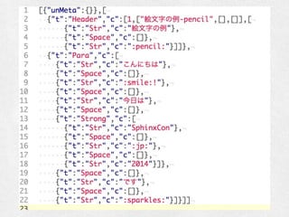 • Markdown → AST → JSON • さらにJSONを入力にして変換することもでき る • JSON → AST → (reST等) • JSONを加工するフィルタを書けば拡張できる