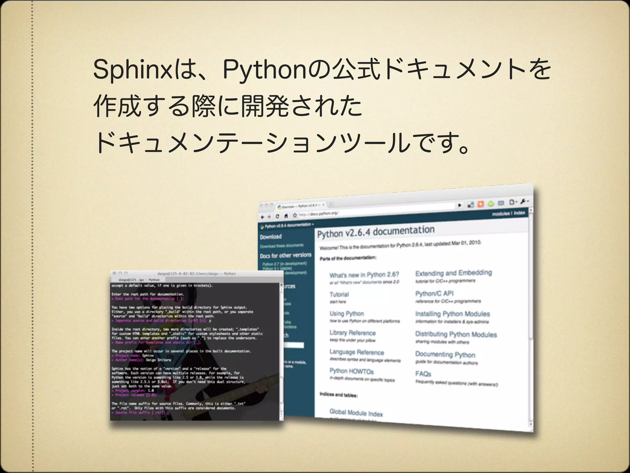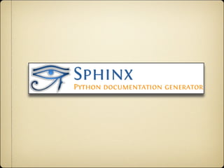 Sphinx is a tool that generates documentation from reStructuredText source files. It can generate HTML, LaTeX, and other formats. Sphinx focuses on hand-written documentation rather than auto-generated API docs. The document provides information on installing Sphinx and converting documentation from other formats like HTML, LaTeX, and Docbook to the Sphinx reStructuredText format.