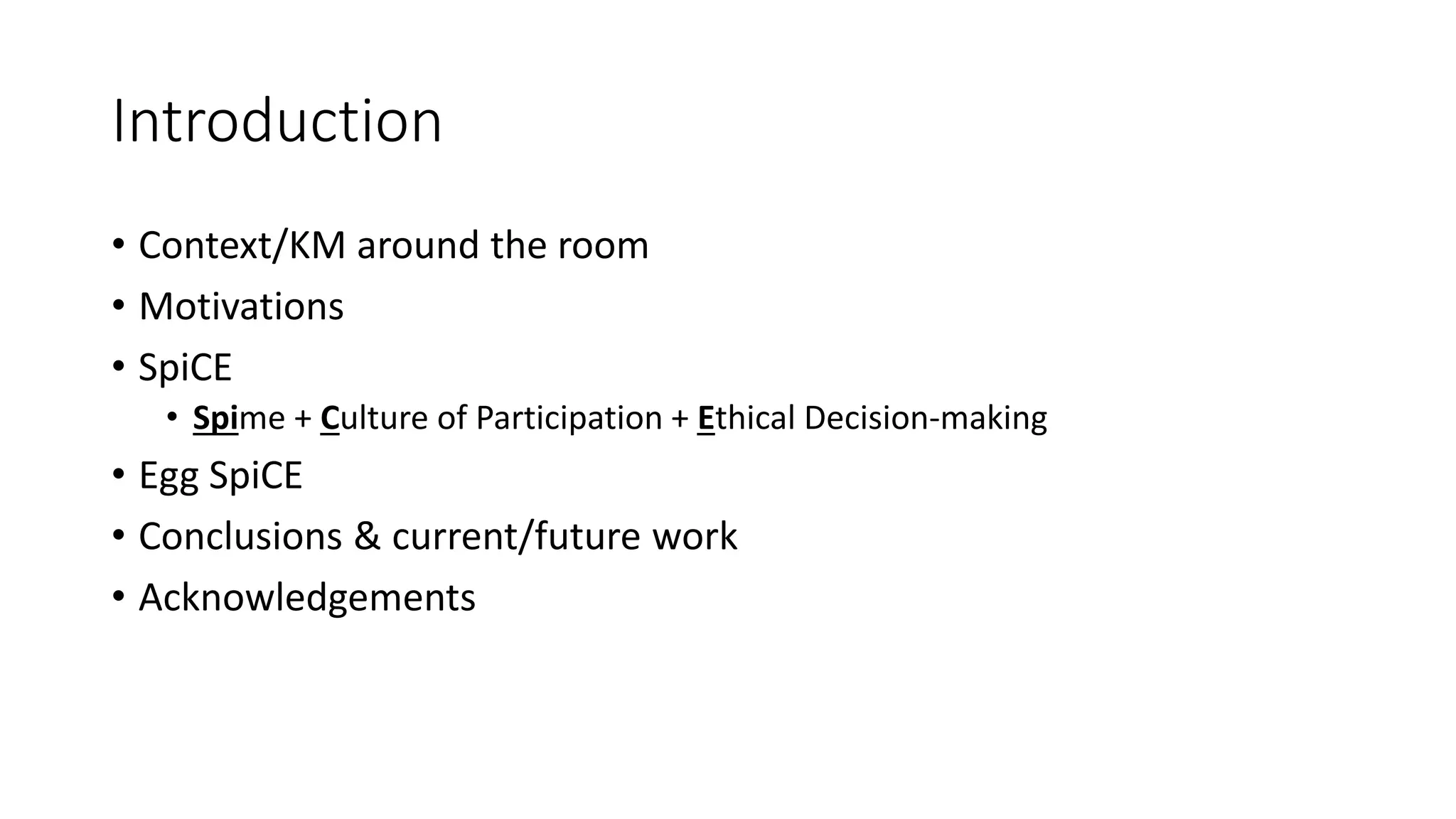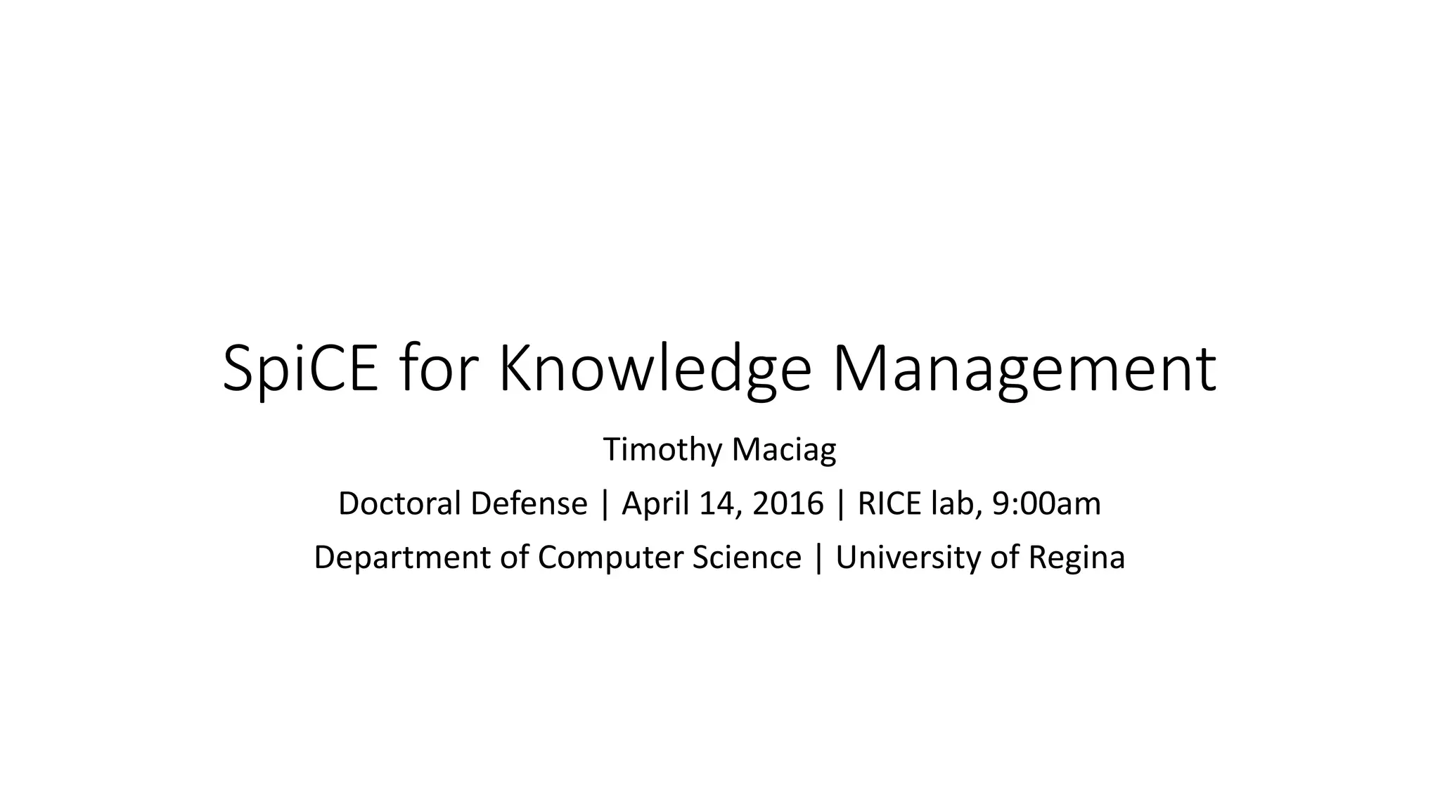 Timothy Maciag presented his doctoral defense on his work developing SpiCE (Spime + Culture of Participation + Ethical Decision-making) for knowledge management. SpiCE aims to provide a more sustainable blueprint for knowledge management by focusing on people, technology, and process. Maciag demonstrated SpiCE through an Egg SpiCE case study on food sustainability which engaged local participants using narratives, surveys and a technology platform. Future work will include further analysis of SpiCE implementations and its potential for life-long learning.