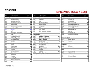 Spicepark is a company that stocks a variety of electronic components including semiconductors, passive parts, batteries, mechanical parts, DC motors, lamps, and power supplies. The document provides an inventory list of over 3,900 total components with details on the type, manufacturer, and quantity of each item. It also includes a more specific list of 21 MOSFET components from Toshiba with part numbers and product model types.