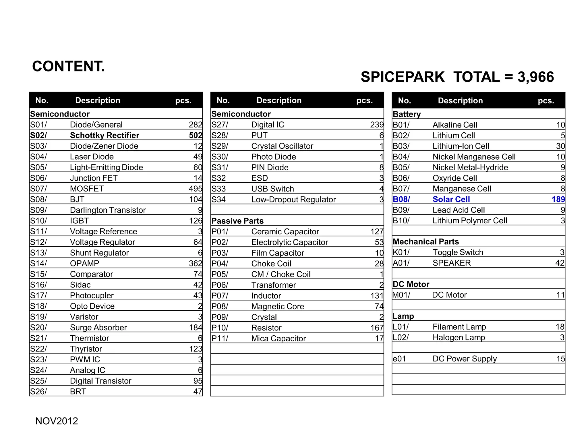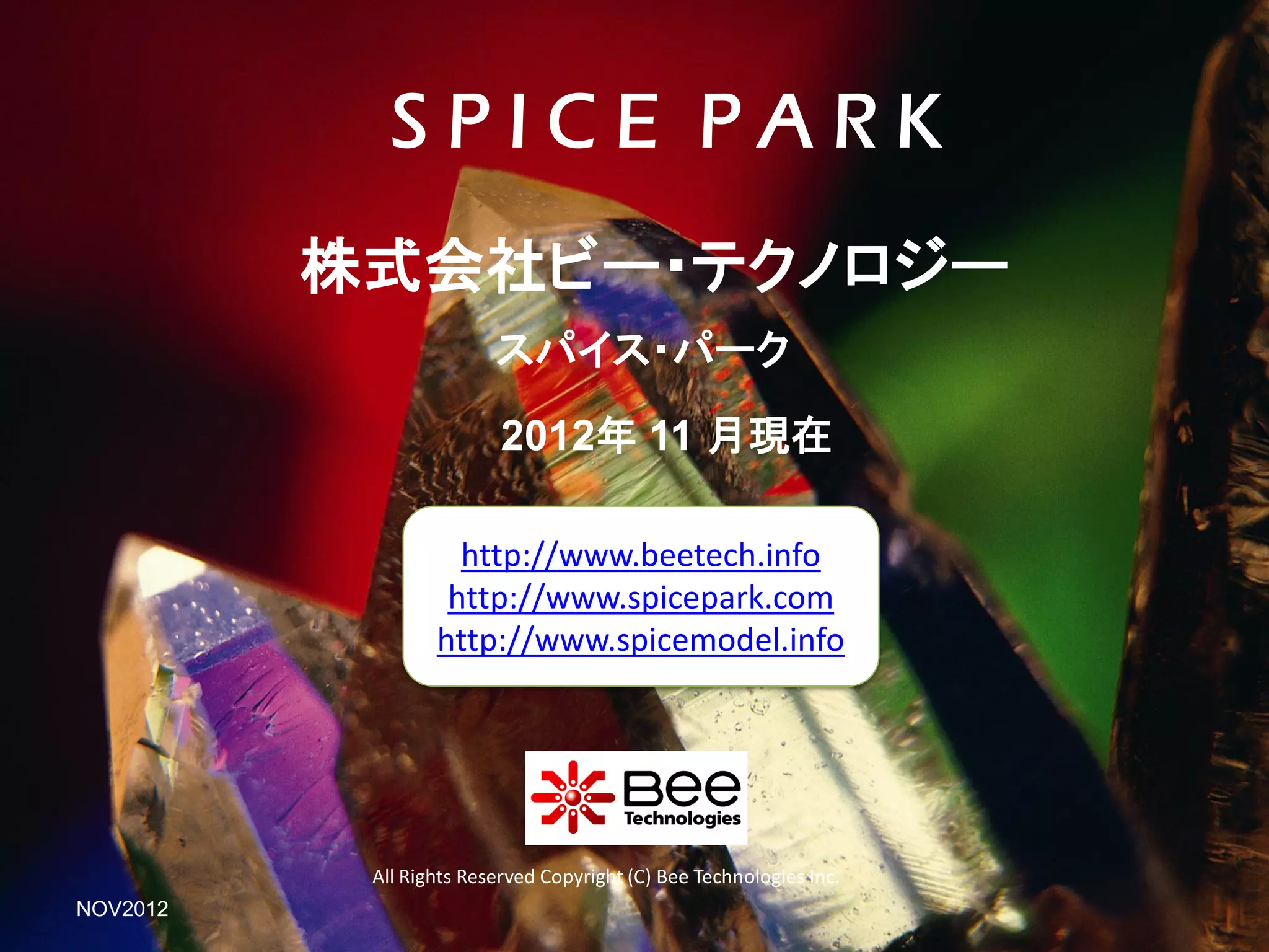 Spice Park is a database containing nearly 4,000 electronic components including semiconductors, passive parts, batteries, mechanical parts, DC motors, lamps, and 189 solar cells from 15 manufacturers. The solar cells are tracked with manufacturer, part number, and last update date. Spice Park is maintained by Bee Technologies and provides an inventory of electronic components for research and development.