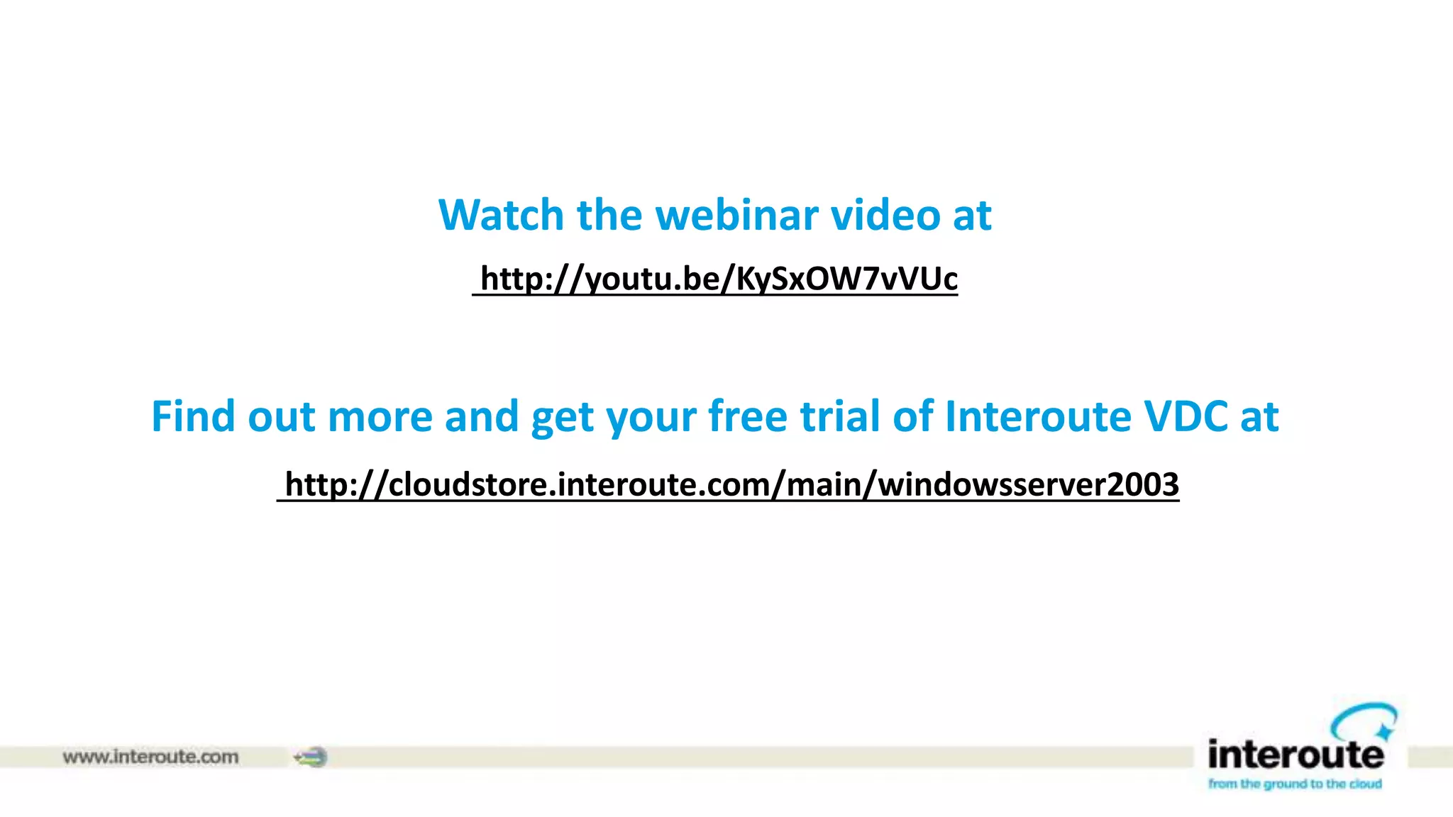 The document discusses the migration from Windows Server 2003 to cloud infrastructure due to the end of Microsoft support on July 14, 2015. It promotes Interoute's Virtual Data Centre (VDC) as a secure, high-performance IaaS solution with multiple infrastructure options and cost-efficient pricing. Key benefits include improved performance, reduced maintenance, and the ability to build a hybrid cloud environment without compromising security.
