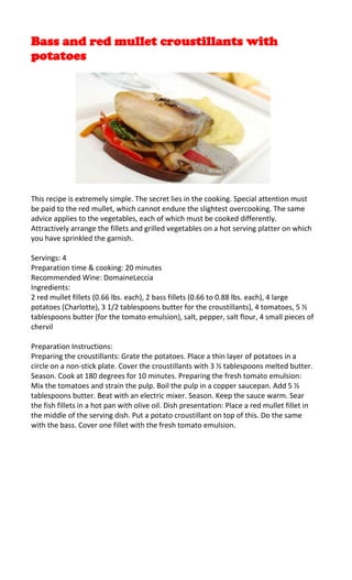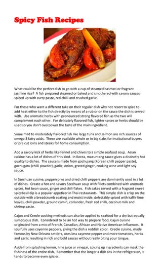 The document provides various spicy fish recipes that pair well with basmati or jasmine rice, emphasizing the importance of using the right spices and herbs depending on the type of fish. It highlights specific cuisines such as Korean, Szechuan, Cajun, and Creole, detailing unique ingredients and preparation methods. A particular recipe for bass and red mullet croustillants is included, outlining steps for perfect cooking and presentation.