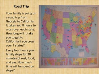 The document presents a series of math word problems for 3rd-grade students, including scenarios related to road trips, melting snowmen, water fountain usage, and morning routines. It outlines how to approach these problems using hints and manipulatives, while also providing the corresponding answers. Additionally, it mentions 3rd-grade math standards related to addition, subtraction, multiplication, division, time, and data interpretation.