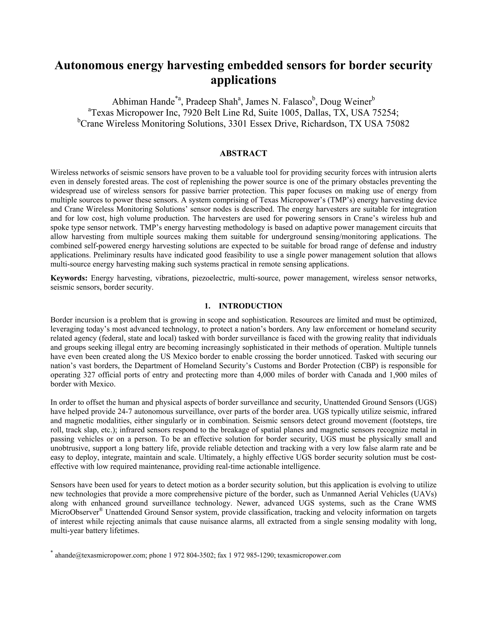 This document discusses using energy harvesting from multiple sources to power unattended ground sensors for border security applications. It describes a system using Texas Micropower's energy harvesting devices and Crane Wireless Monitoring Solutions' sensor nodes. The energy harvesters are suitable for low-cost, high-volume production and can harvest energy from vibrations and solar power. Preliminary results indicate the feasibility of using a single power management solution that allows multi-source energy harvesting to increase sensor network lifetime for remote monitoring applications such as border security.