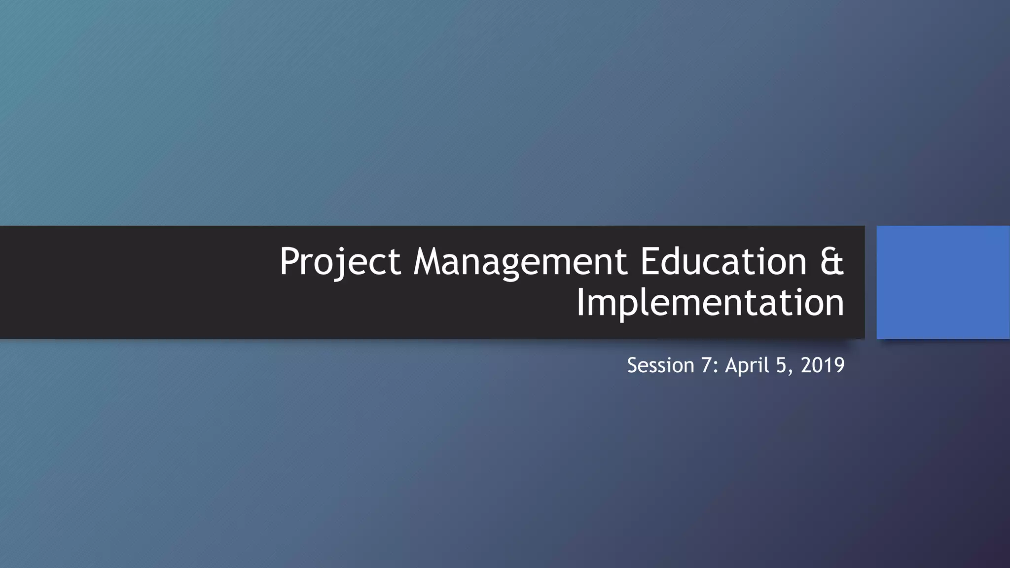 The document outlines a project management education and implementation session held on April 5, 2019, focusing on training, certification, and the implementation of project management in organizations. It features a guest speaker, Eugene Spiegle, who discusses various project management certifications, including PMP and CAPM, as well as the launch of a new book co-authored by him. Additionally, the session covers key aspects of project management including structures, risk management, and the importance of documentation and software in project implementation.