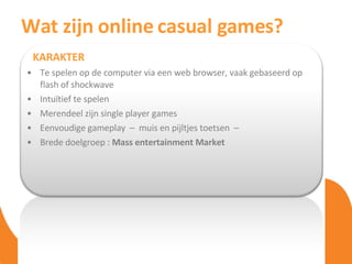 Wat zijn onlinecasual games? KARAKTER Te spelen op de computer via een web browser, vaak gebaseerd op flash of shockwave Intuïtief te spelen Merendeel zijn single player games Eenvoudige gameplay – muis en pijltjes toetsen – Brede doelgroep : Mass entertainment Market