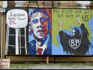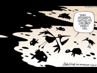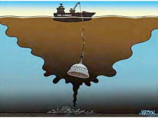 The document discusses the Deepwater Horizon oil spill that occurred on April 20, 2010, detailing its substantial environmental impact and comparing it to previous spills. It highlights BP's history of safety violations and the financial implications of the spill, including projected losses in tourism and wildlife recovery times. Additionally, the document critiques the relationship between businesses and government, suggesting a disconnect from public interests in the context of environmental disasters.