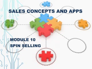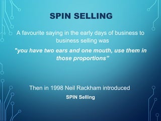 The document discusses the SPIN selling model, which involves asking prospects questions in a specific sequence: Situation, Problem, Implication, and Need-payoff. Situation questions provide context but don't benefit the buyer. Problem questions clarify issues and dissatisfactions. Implication questions develop problems' seriousness to increase motivation. Need-payoff questions get buyers to discuss how solutions meet their explicit needs and benefits. SPIN suggests opening with questions, not features, and setting call objectives to obtain commitments through understanding needs rather than persuasion. It emphasizes preventing over handling objections by not introducing solutions too soon.