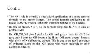 The document discusses spin-spin coupling in NMR spectroscopy, explaining how chemically equivalent protons influence signal peaks in spectra according to the n+1 rule. It specifies types of coupling such as geminal, vicinal, and long-range coupling, each defined by the number of bonds separating protons and their corresponding coupling constants. Additional details on mathematical tools like Pascal's triangle and the impact of molecular structure on coupling constants are also provided.