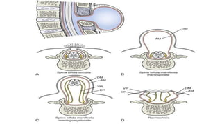 This document provides information about Spina Bifida, a neural tube birth defect where there is incomplete closing of the neural arches and meninges around the spinal cord. It describes the classification and types of Spina Bifida (occulta, meningocele, myelomeningocele), symptoms, diagnosis using imaging and tests, and treatment options which may include surgery to close the opening and manage related issues like hydrocephalus. It emphasizes the importance of emotional support for parents and monitoring the infant's health and development.