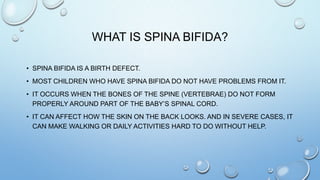Spina bifida is a birth defect that occurs when the bones of the spine do not form properly around the baby's spinal cord. It can range from mild, with no visible defects or problems, to severe, where parts of the spinal cord and nerves push through an opening in the spine. Severe spina bifida can cause problems walking, bladder and bowel control, and coordination. While the exact cause is unknown, folic acid intake before and during pregnancy can help prevent spina bifida. Treatment depends on severity but may include surgery, braces, physical therapy, and managing related issues like bladder control or mobility.