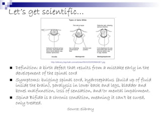 Spina bifida is a birth defect that results from a mistake early in the development of the spinal cord. It causes symptoms like a bulging spinal cord, hydrocephalus, paralysis in the lower back and legs, and bladder and bowel issues. Spina bifida is a chronic condition meaning it cannot be cured, only treated, through surgery, medication, and physiotherapy. Many people with spina bifida will require assistive devices like braces, crutches, or wheelchairs.