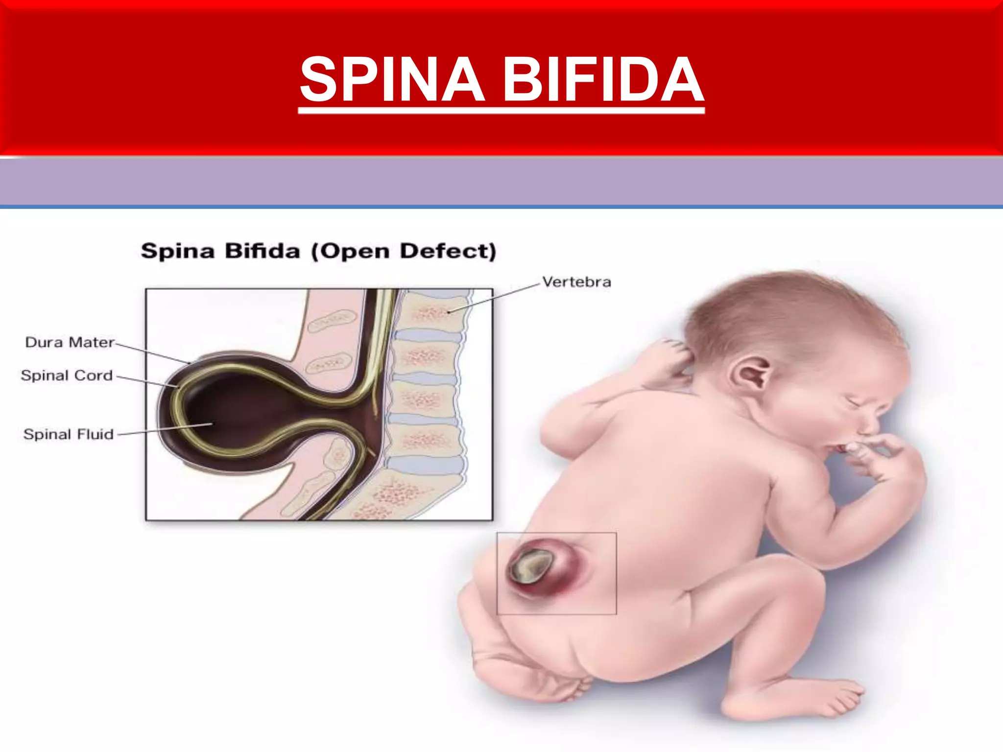 Spina bifida is a birth defect where the spine and spinal cord do not form properly, leaving an opening in the spine. It occurs in about 1-2 per 1000 live births. There are three main types: spina bifida occulta which has no symptoms, meningocele which is a sac protruding from the spine containing fluid and membranes, and myelomeningocele which is the most severe form where the spinal cord and membranes protrude out. Treatment depends on the type but may include surgery to close the opening after birth along with management to prevent infections and complications.