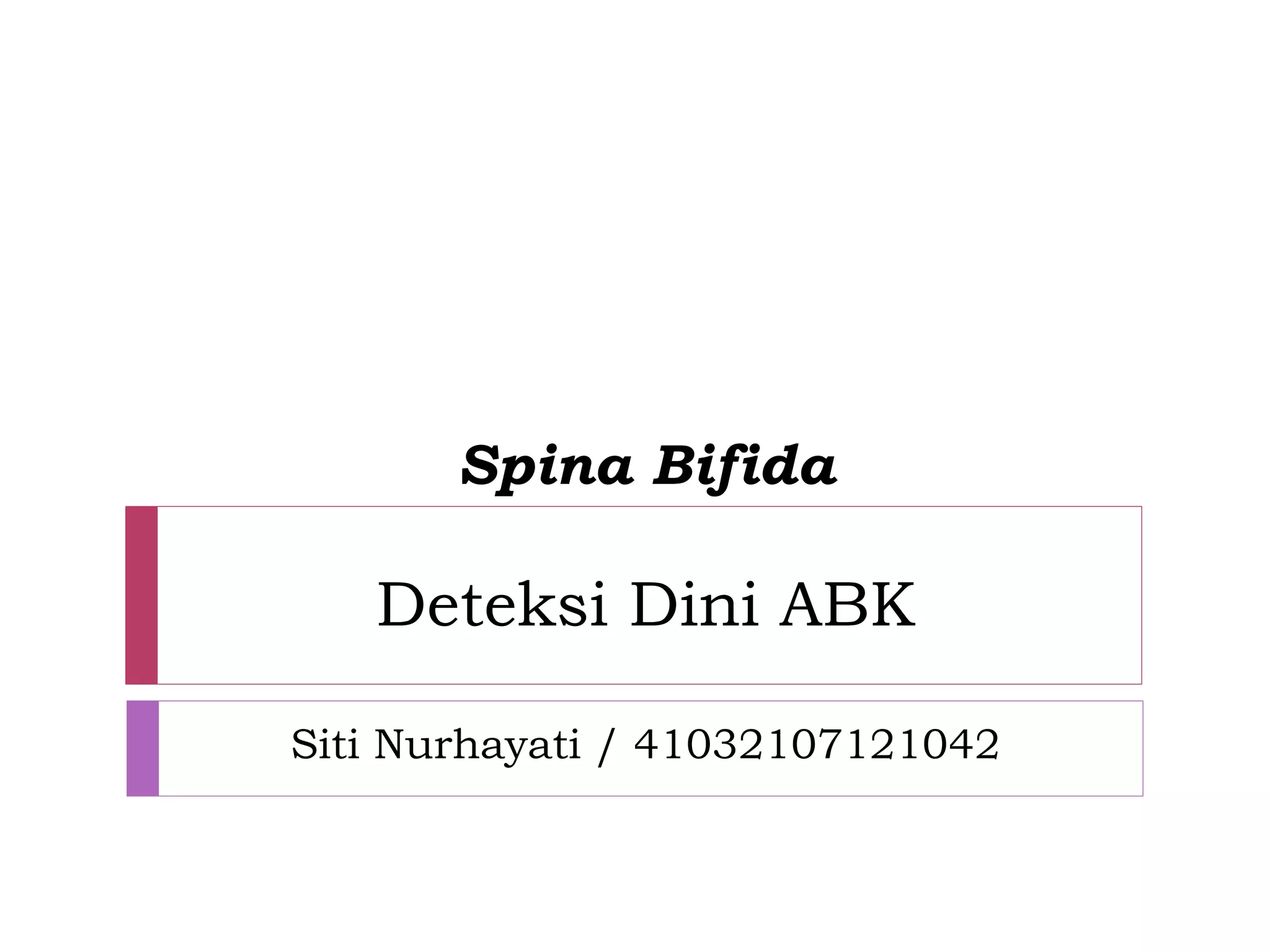 Spina bifida adalah cacat lahir yang terjadi akibat malformasi tulang belakang, dengan prevalensi sekitar 1 dari 1000 kelahiran. Jenis spina bifida meliputi okulta, meningokel, dan myelomeningokel, yang dapat menyebabkan berbagai komplikasi neurologis dan fisik. Pencegahan dapat dilakukan melalui konsumsi asam folat selama kehamilan.