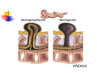 Spina bifida is a disorder where the spine and spinal cord do not develop properly, often resulting in paralysis and other issues. It occurs due to failure of the spine to close during the first month of pregnancy, and may be related to folic acid deficiency. Spina bifida can range from mild vertebral malformations to more severe cases where the spinal cord and membranes protrude outside the body. It affects mobility and can also cause hydrocephalus, incontinence, cognitive problems, and other health issues. The incidence is about 1 in 2000 live births for the most severe type, and 1-2 per 1000 for all types of spina bifida.