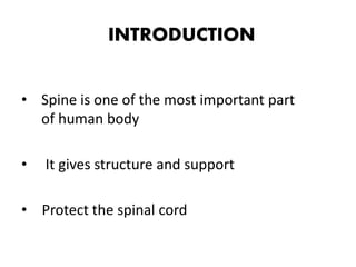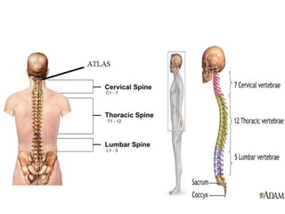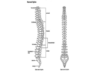 1. Vertebral anatomy including the 7 cervical, 12 thoracic, and 5 lumbar vertebrae. It outlines the parts of each vertebra including the body, pedicles, lamina, processes and foramina.