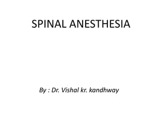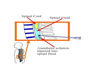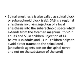 Spinal anesthesia involves injecting local anesthetic into the fluid-filled space surrounding the spinal cord. This blocks pain and other sensations below the injection site. The document discusses the anatomy of spinal anesthesia, commonly used local anesthetics, indications, contraindications, proper administration technique, and potential complications and their treatments. It provides a comprehensive overview of spinal anesthesia.