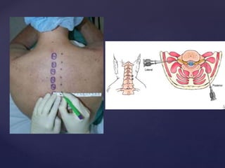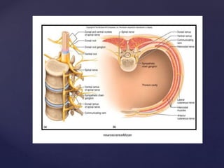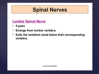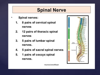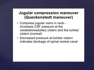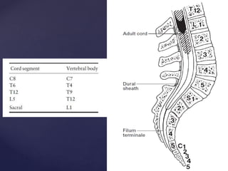 The CSF has a volume of around 150 ml and a pressure between 8-15mmHg. It circulates slowly through the subarachnoid space and cisterns in the brain. The spinal meninges consist of the dura mater, arachnoid mater, and pia mater. The spinal cord is around 45cm long and has cervical and lumbar enlargements, with 31 pairs of spinal nerves attached. It receives blood supply from the anterior and posterior spinal arteries and associated segmental arteries.