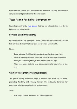 Yoga effectively promotes spinal health through techniques that enhance flexibility, alignment, and strength of the spine. Specific poses such as forward bend, cat-cow, and downward-facing dog are highlighted for their benefits in decompression and relieving tension. Overall, integrating these practices into daily routines can contribute to better spinal health and well-being.