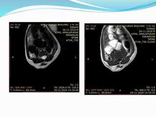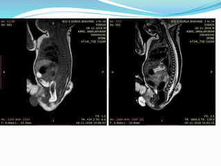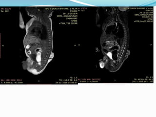 This document discusses spinal dysraphism, which refers to congenital malformations of the spine and spinal cord resulting from incomplete closure of tissues during embryonic development. It describes the normal embryological development of the spinal cord and the various types of spinal dysraphism, including open dysraphisms like myelomeningocele and closed dysraphisms with and without subcutaneous masses. Specific conditions are defined, like lipomyelomeningocele versus lipomyelocele, and imaging features of each type of dysraphism are provided with examples. Chiari malformations that can be associated with open dysraphisms are also reviewed.
