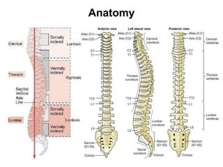 This document discusses spinal anatomy, trauma, and injury. It covers the epidemiology, mechanisms, classifications, diagnosis, and management of spinal cord injuries. Some key points include: