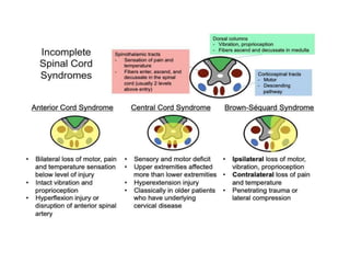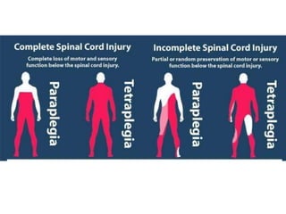 - Spinal cord injuries can be complete or incomplete. Complete injuries have no motor or sensory function below the level of injury while incomplete injuries have some spared function.