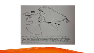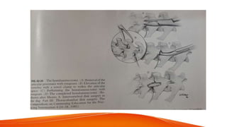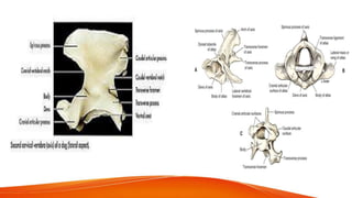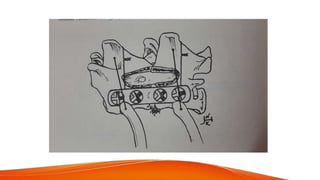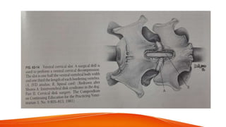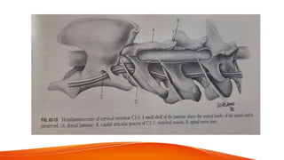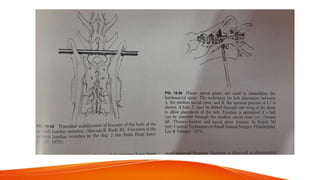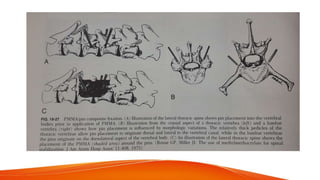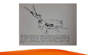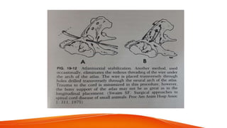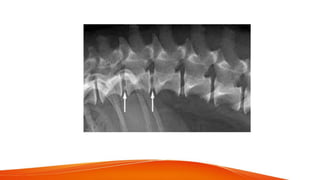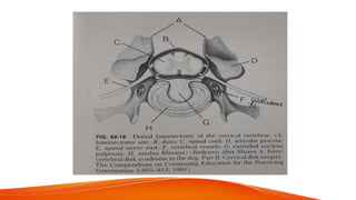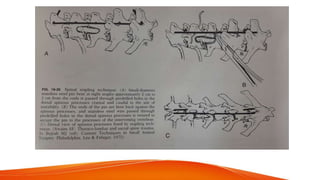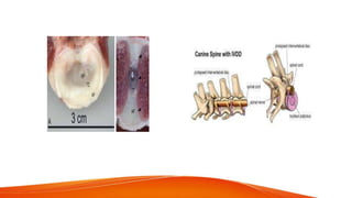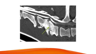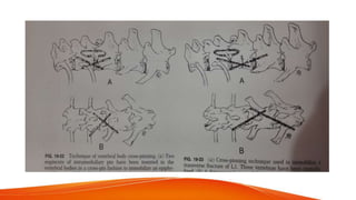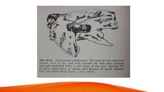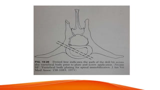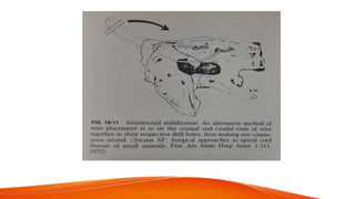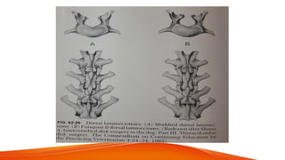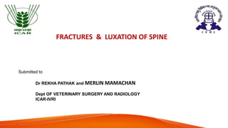 This document provides information on fractures and luxations of the spine in animals. It discusses the intrinsic and extrinsic forces that affect the spine, the anatomy of vertebrae and spinal units, and common sites of fractures. It then describes general treatments for spinal injuries including medications, imaging, and splinting or casting. Surgical techniques for various types of spinal fractures and injuries are outlined, including fixation methods, decompression procedures, and treatment for specific conditions like cervical instability and intervertebral disc disease.