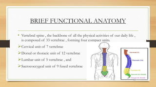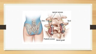 Spinal stabilization involves surgical procedures to treat acute spinal injuries and conditions by restoring vertebral alignment and removing bone fragments. The degree of stabilization depends on the severity of the problem. Surgery involves inserting instruments like screws and plates in the back to stabilize the spine and facilitate fusion after decompression. Minimally invasive procedures perform stabilization through small incisions without damaging muscles. Recovery takes around six months with limited activity and physical therapy starting in the first week.