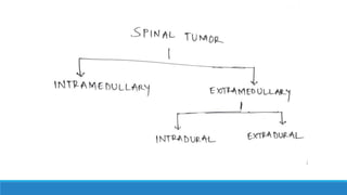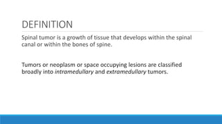 The document discusses spinal tumors, classifying them into intramedullary and extramedullary types, with emphasis on benign tumors that compress the spinal cord. It outlines symptoms associated with spinal tumors, including various syndromes, and details treatment options such as surgery and physiotherapy for recovery and management of functional mobility. Prognosis largely depends on the rapidity of treatment and the extent of damage caused by the tumor.