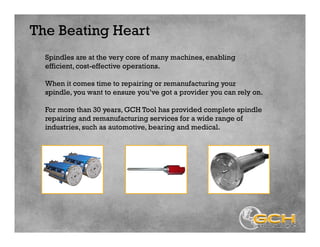 GCH Tool provides specialized spindle repair and remanufacturing services for various industries, including automotive and medical, backed by over 30 years of experience. Their comprehensive process includes failure analysis, chemical cleaning, and precision machining, ensuring each spindle meets or exceeds OEM specifications. Clients can contact GCH Tool for expert advice on spindle solutions and access to a range of new and remanufactured spindles.