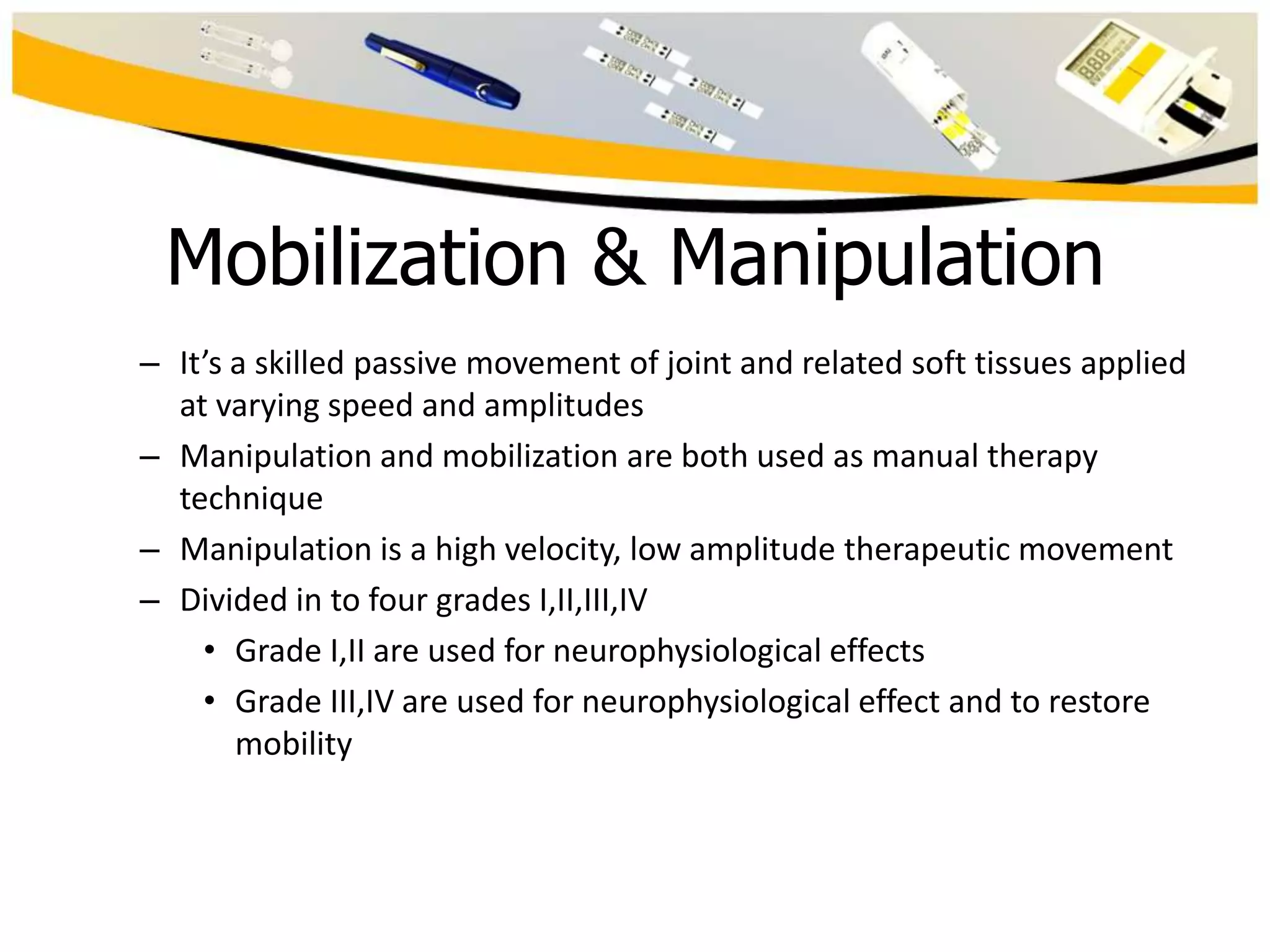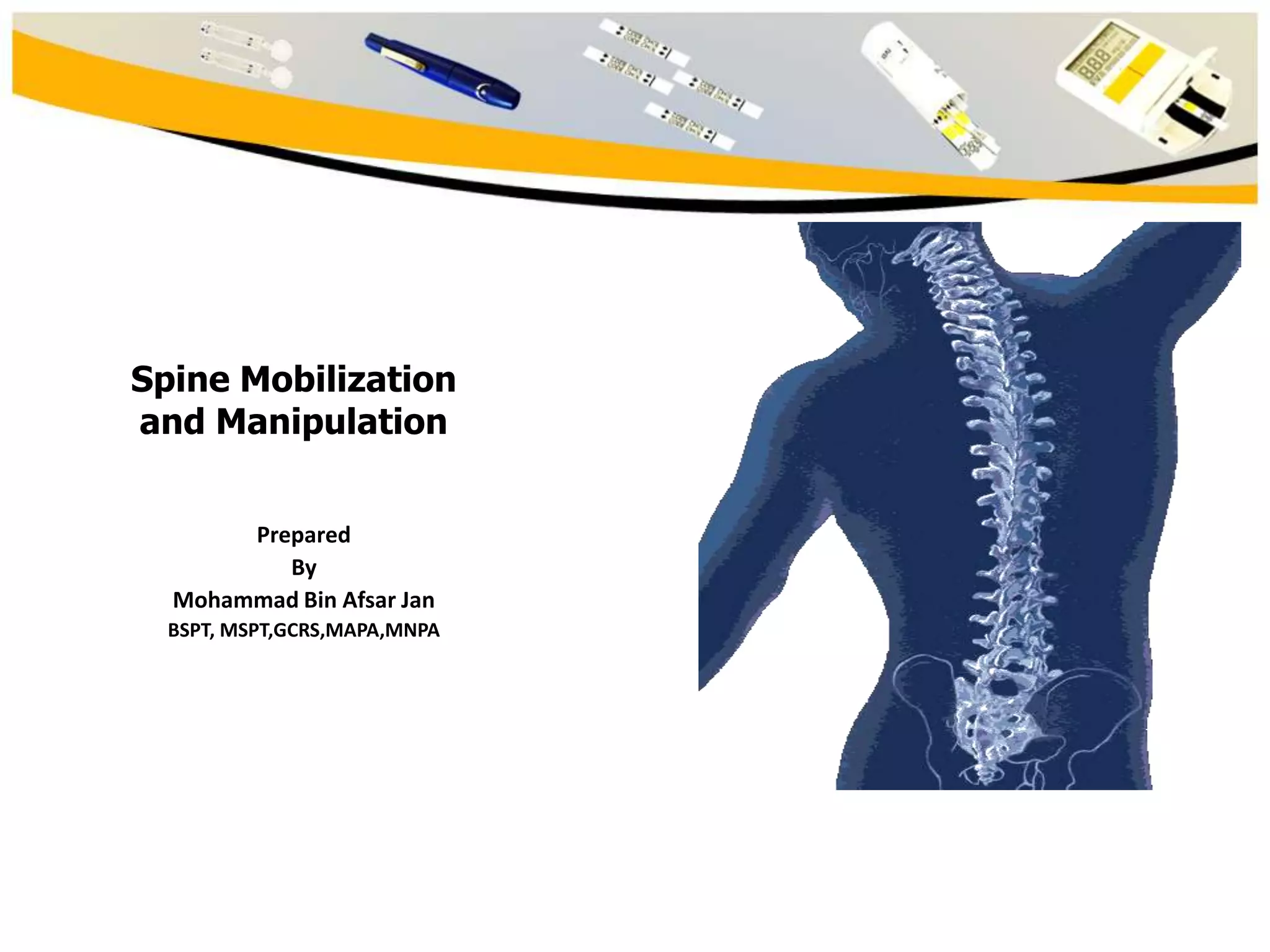 This document discusses spine mobilization and manipulation techniques. It defines mobilization and manipulation as skilled passive movements applied to joints and soft tissues. Manipulation involves high velocity, low amplitude movements while mobilization can involve oscillations of varying amplitudes. The effects of manipulation include mechanical, neurophysiological, and psychological impacts. Mechanical effects involve restoring tissue extensibility and range of motion. Neurophysiological effects occur through stimulation of mechanoreceptors and descending pain pathways in the central nervous system. Psychological effects involve reducing pain and anxiety through reassurance. Clinical decision making involves considering factors like joint mobility, pain response, and targeted treatment effects when selecting techniques.