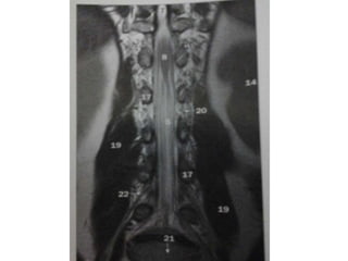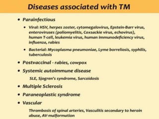 This document provides an overview of common spinal cord diseases characterized by high signal within the cord on T2-weighted MRI. It discusses the differential diagnosis and key features of demyelinating diseases like multiple sclerosis and neuromyelitis optica, acute disseminated encephalomyelitis, transverse myelitis, spinal cord tumors, vascular conditions like infarction and vasculitis. Multiple sclerosis is the most common demyelinating disease and can present with short segment focal lesions in the posterior spinal cord with associated periventricular brain lesions. Neuromyelitis optica preferentially involves the optic nerve and spinal cord.