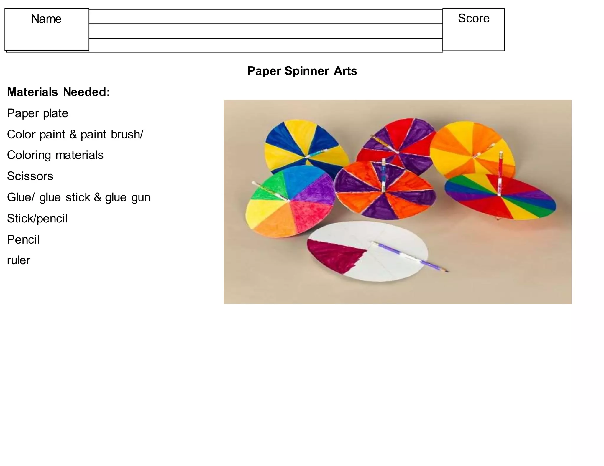 This document lists the materials needed for a paper spinner arts and crafts project, which includes a paper plate, paint and coloring materials, scissors, glue or a glue stick and glue gun, a stick or pencil, pencil, and ruler. The project allows children to make a paper plate spinner to decorate and play with.