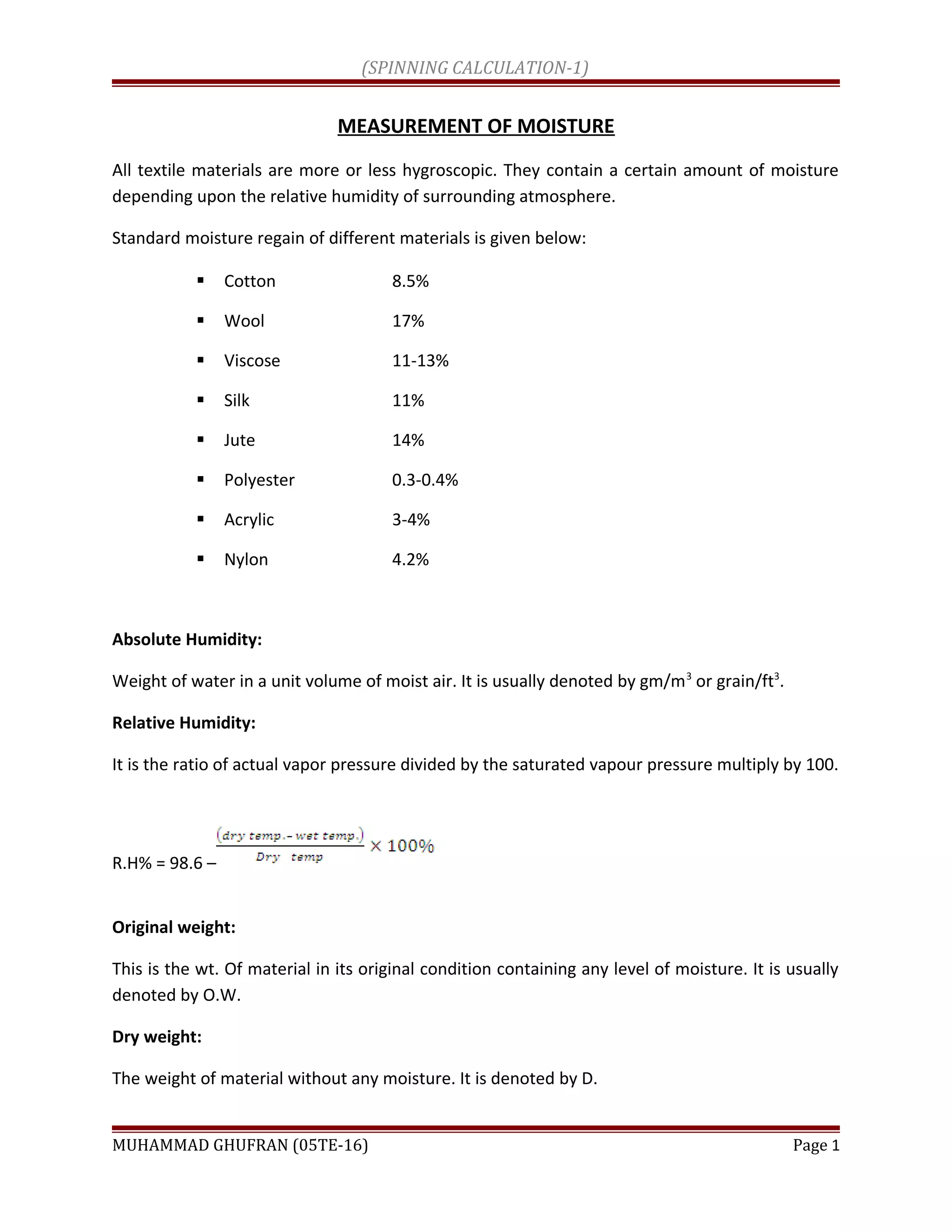 This document provides information about measuring moisture in textile materials and various related calculations. It lists the standard moisture regain for different materials like cotton, wool, viscose, silk, and jute. It also defines terms like absolute humidity, relative humidity, original weight, dry weight, oven dry weight, correct invoice weight, regain, and moisture content. The document includes examples of calculations for moisture content, regain, conditioned count weight, blending and mixing of materials, and piping diameters.