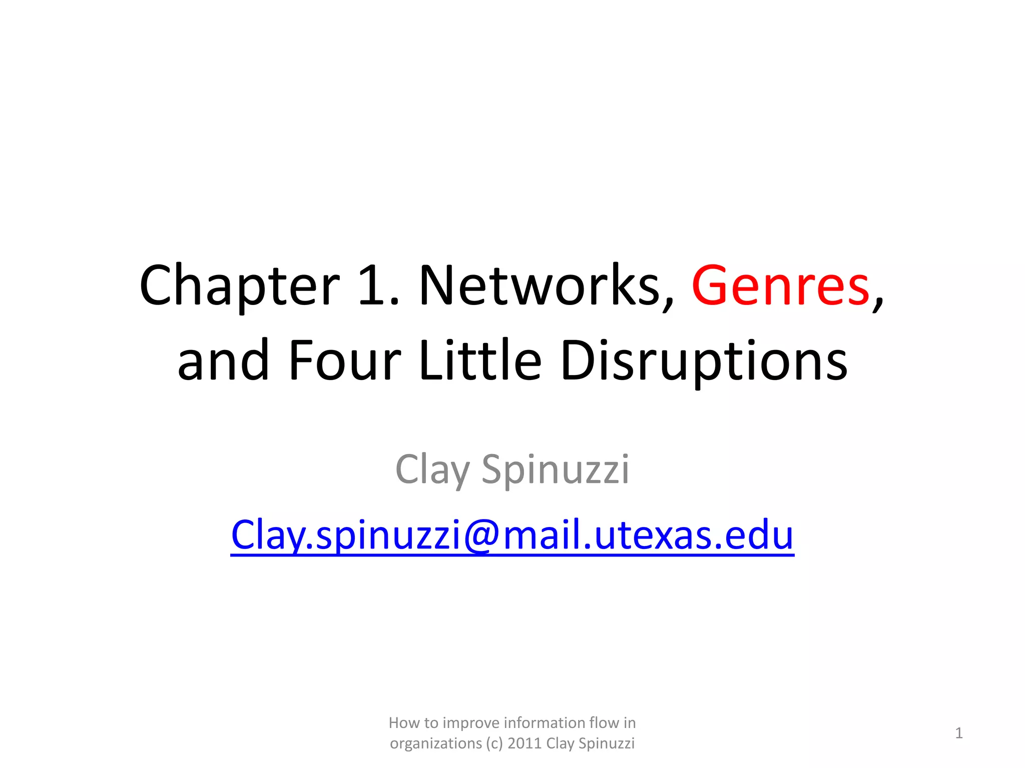This document discusses genres and how they can be analyzed to improve information flow in organizations. It defines genres as "typified rhetorical responses to recurring social situations" that act as "tools-in-use." Genres can be examined based on their development over time and how they function at different levels of activity (macro, meso, micro). Analyzing how genres relate to each other through genre ecologies can also provide insights. The document provides examples and exercises for applying genre analysis in work contexts like social media to better understand information flow challenges.