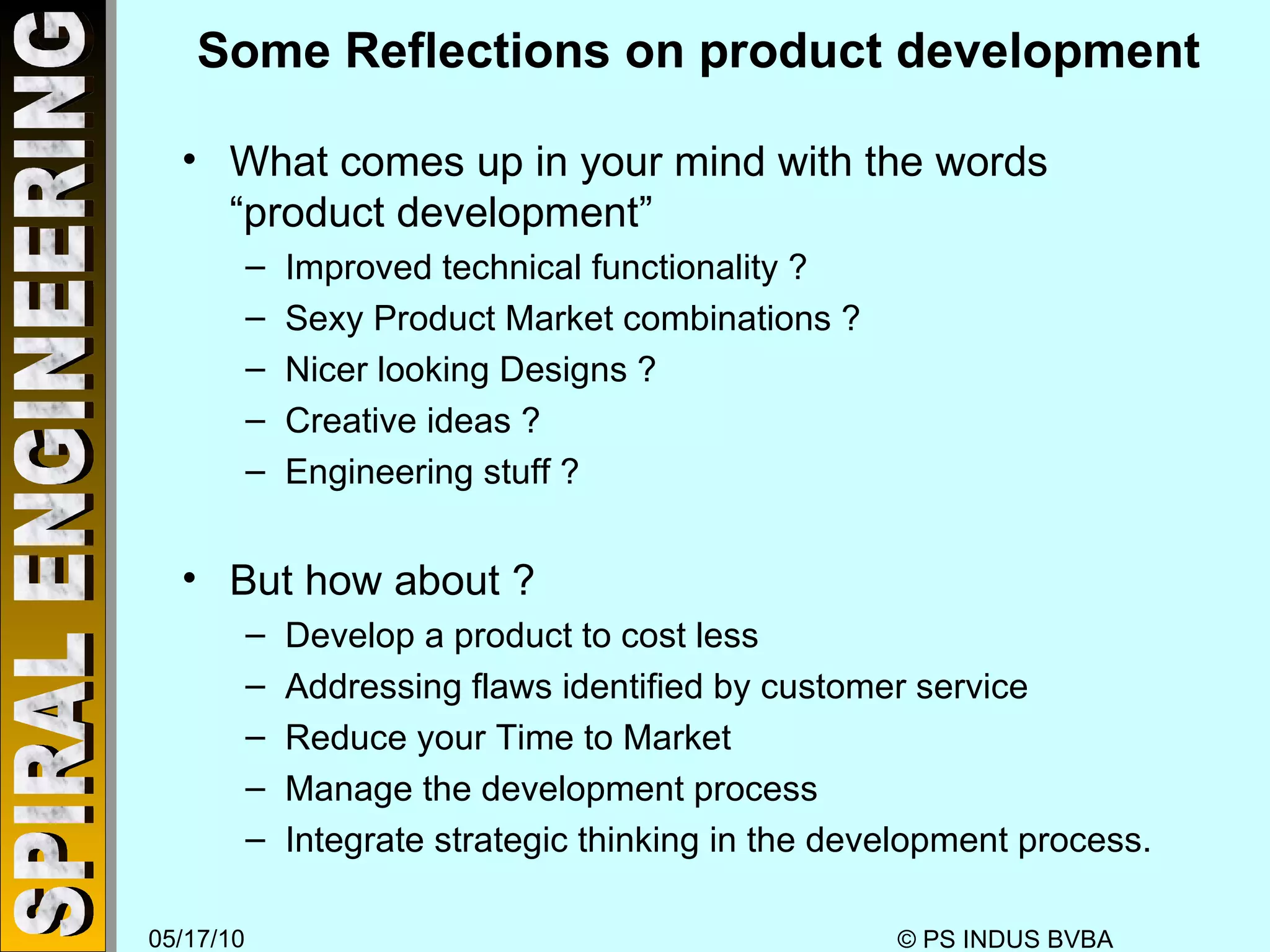 The document discusses an approach called spiral engineering for developing products. It involves quickly exploring ideas through parallel, cross-functional work in early stages before focusing the design. Departments work concurrently at different levels of abstraction. The process is managed through concentric design levels with increasing restrictions and sequential milestones to balance creativity, thoroughness, and manageability while minimizing development time.