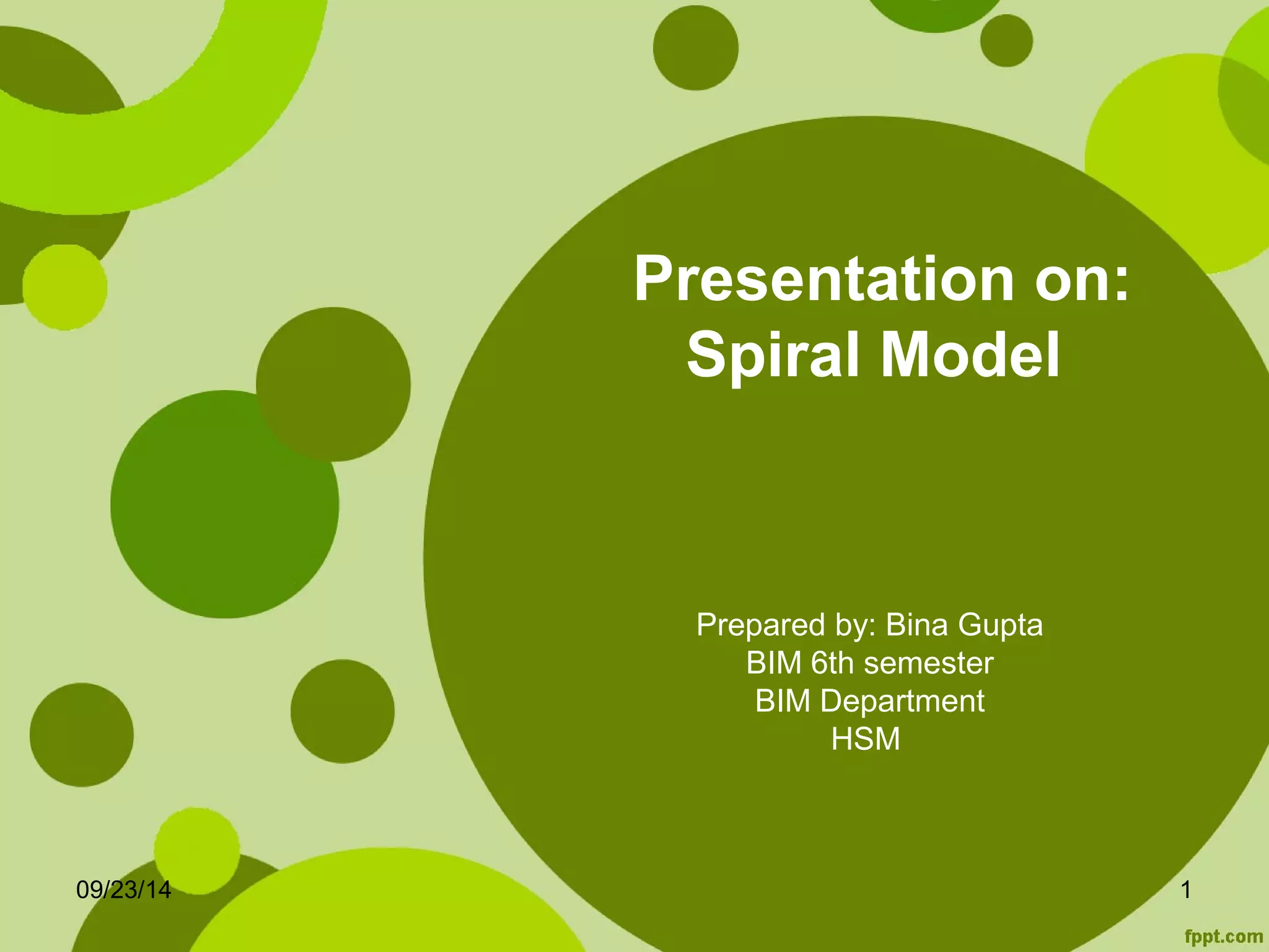 The document presents information on the Spiral Model software development process. It discusses that the Spiral Model combines elements of the prototype model and waterfall model. It involves dividing the process into task regions like customer communication, planning, risk analysis, engineering, and construction. Each task region results in further refinement through iterations of the spiral. The Spiral Model allows for risk analysis and adding new features throughout the process.