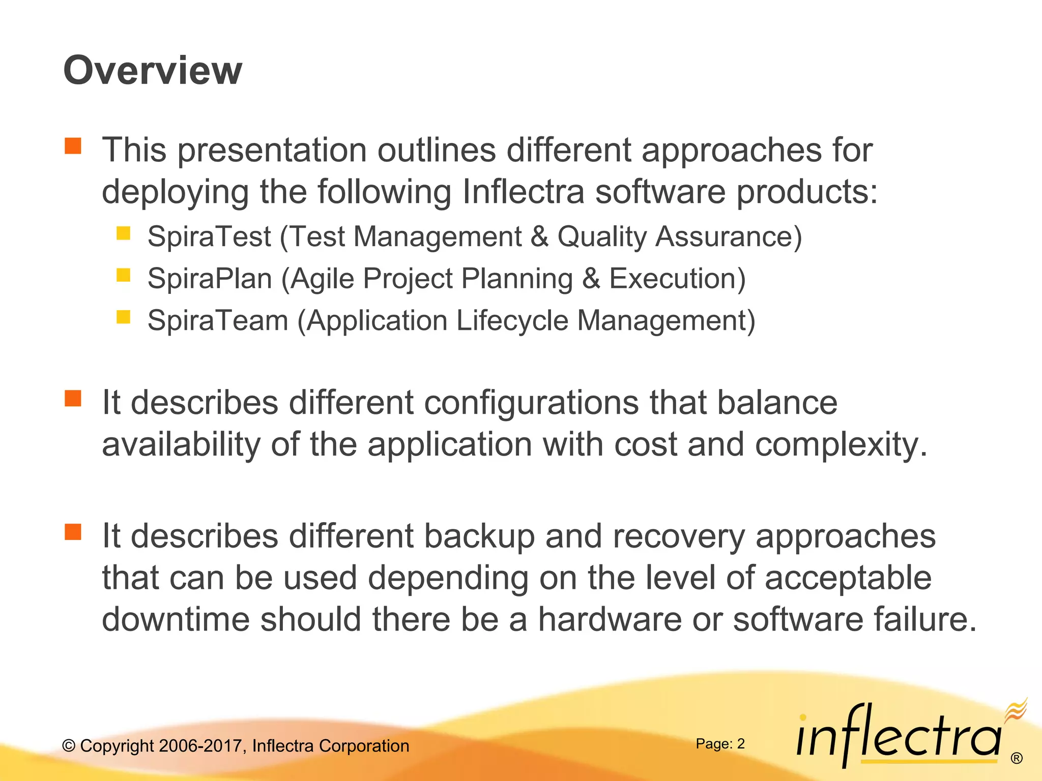 This presentation outlines deployment strategies for Inflectra software products, focusing on high availability, backup, and recovery configurations. It discusses various system setups ranging from basic to clustered SQL server configurations while highlighting limitations and redundancy options. Backup strategies include tape backups, differential backups, and the use of warm standby servers for rapid recovery in case of failures.