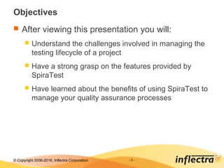 SpiraTest is an integrated solution for managing requirements, test cases, and defect tracking in quality assurance processes, addressing common challenges in QA testing such as lack of visibility and ad-hoc processes. The software offers a comprehensive suite of features including requirements management, test case execution, release management, and incident tracking, all in a user-friendly web-based interface. It is designed to enhance project lifecycle management and can integrate with automated testing tools, providing robust reporting and technical support.