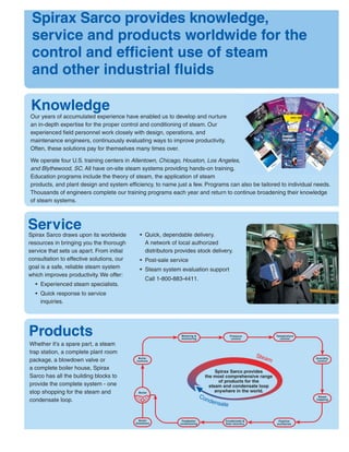 Spirax Sarco specializes in the control and efficient use of steam and other industrial fluids, offering a comprehensive range of products and services for steam and condensate systems. Their offerings include boiler controls, steam traps, flowmeters, and training programs to enhance productivity and system reliability. The company emphasizes quick service, dependable delivery, and extensive post-sale support, ensuring safe and efficient steam system operations.
